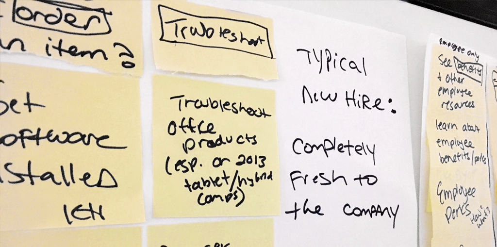 The process required many sharpies and sticky notes. Quantitative data, such as; terms frequently searched, applications, and page visits were pulled from Google Analytics and the help desk center to help kick off the brainstorming session.