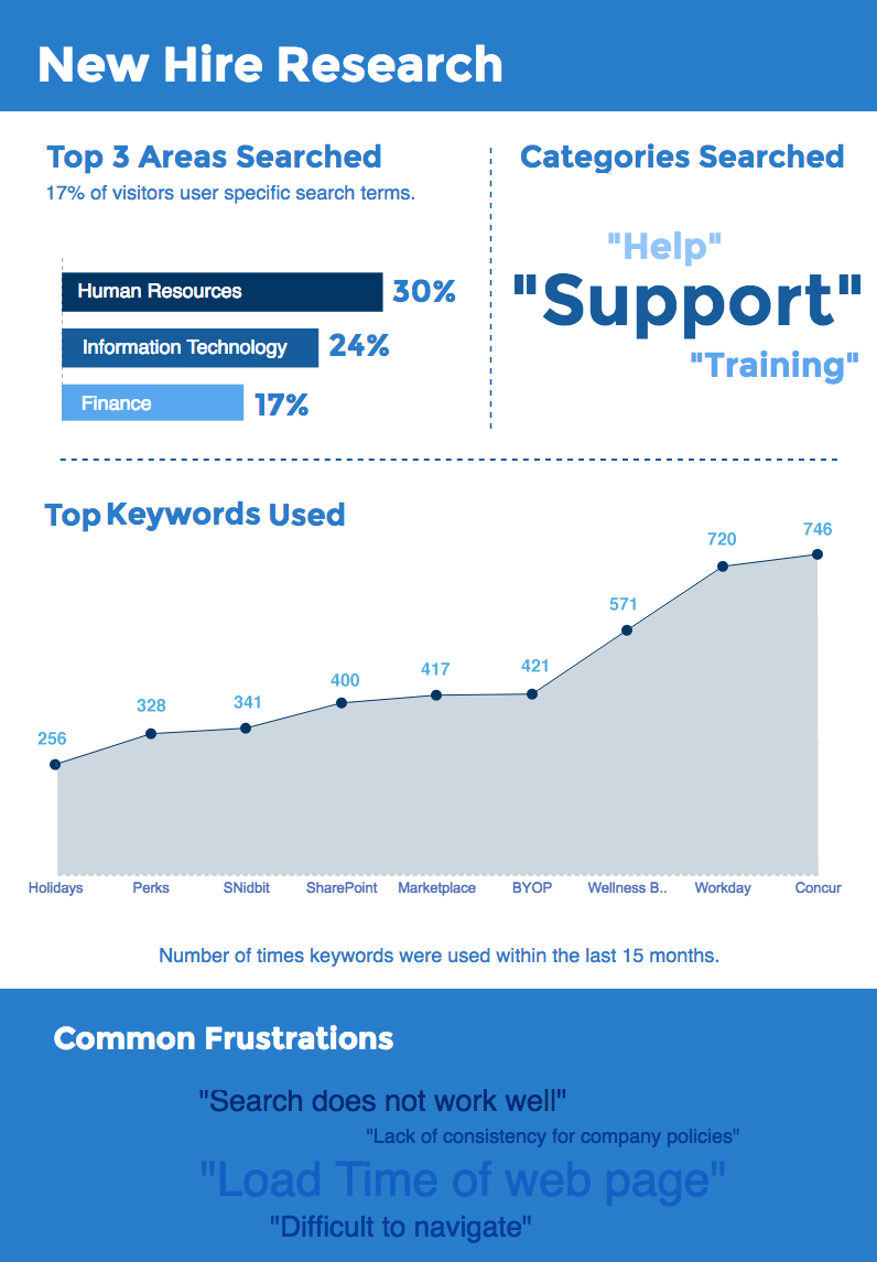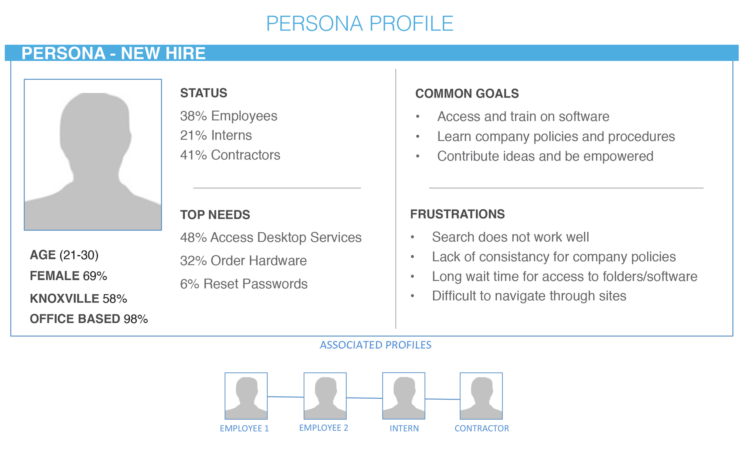 User research was done over a four week period to understand new hires and create a new hire persona; then four profiles were established;