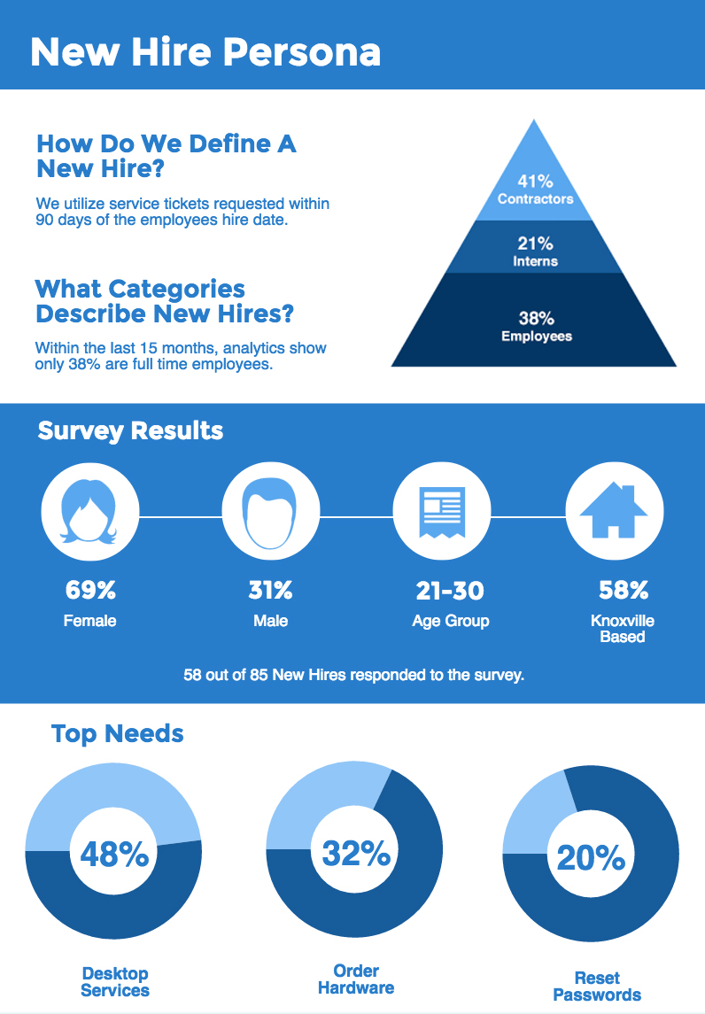 Results show that the new hires are ages 21-30 years old, 69% are female, and are office-based. Their top needs, in general are: